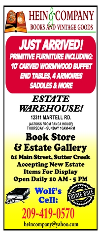 HEIN & COMPANY. Books and vintage goods. 61 Main Street, Sutter Creek and Estate Warehouse, 12311 Martell Road, Martell. . 209-560-3007