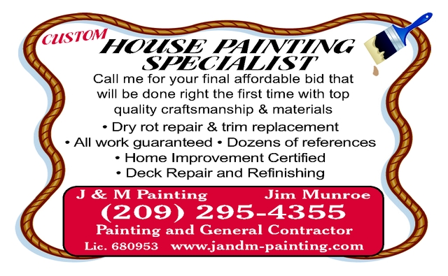 J & M HOUSE PAINTING SPECIALIST. All work guaranteed. References available. Deck repair or refinishing. Jim Munroe, Painting & General Contractor. License #680953. 209-295-4355