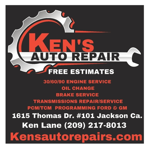 KEN'S AUTO REPAIR. Free estimates. 1615 Thomas Drive, #101, Jackson. Ken Lane 209-217-8013